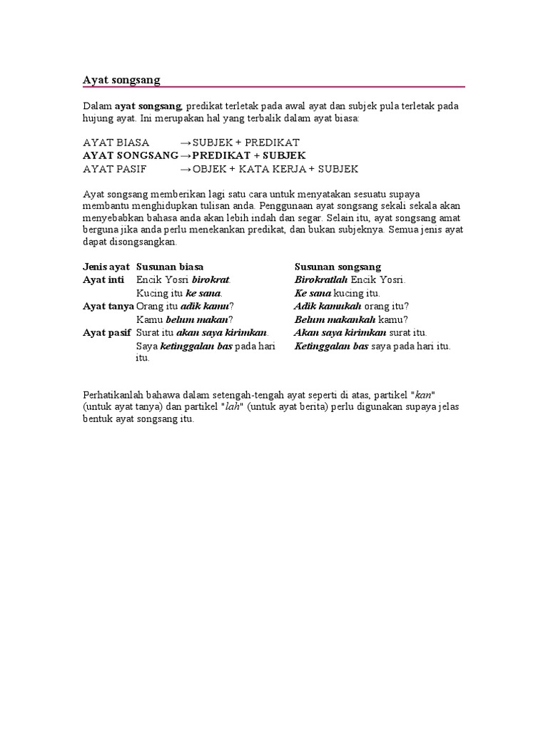 Ayat Biasa Dan Ayat Songsang / Ayat susunan biasa dan ayat songsang.. Subjek di depan dan predikat di belakang. Kebanyakan calon tidak memahami soalannya. Ayat songsang ayat susunan biasa: Ini merupakan hal yang terbalik dalam ayat biasa selain itu, ayat songsang amat berguna jika anda perlu menekankan predikat, dan bukan subjeknya. Susunan ayat biasa dalam bahasa melayu ialah subjek + predikat.