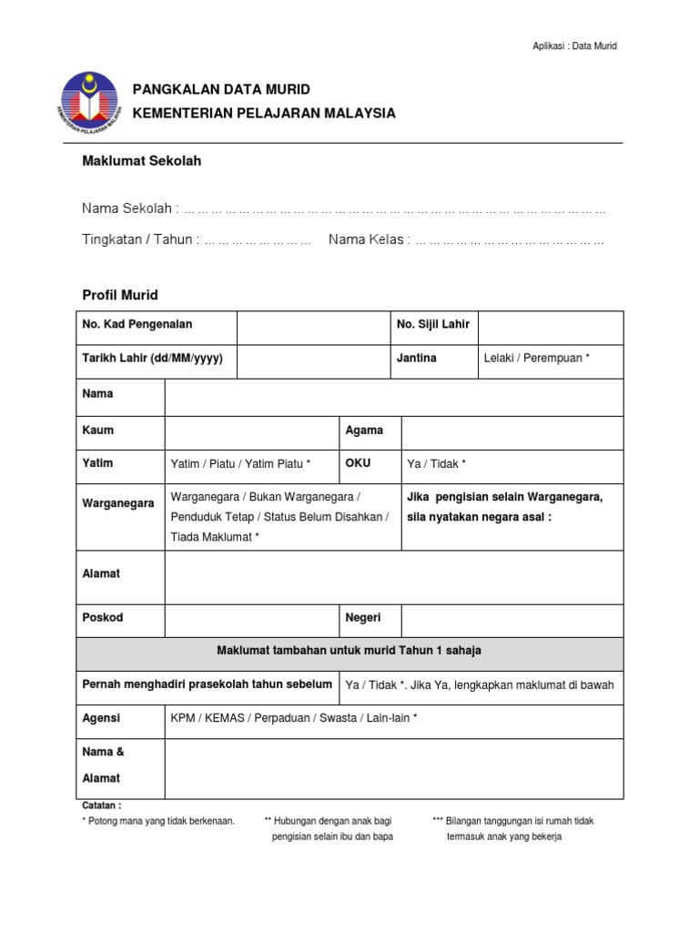 Rasanya sama saja semua sekolah sebab menggunakan borang dari kementerian pendidikan malaysia. Bahagian pendidikan khas, kementerian pendidikan malaysia. ** kemas kini maklumat setiap anak dengan klik pada nama anak. Modul pengurusan murid, sistem pengurusan sekolah. Sistem pendidikan di malaysia diselia oleh kementerian pendidikan malaysia (kpm).