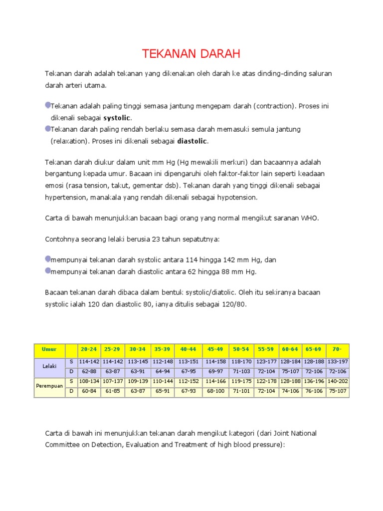 Nombor atas dipanggil tekanan darah sistolik walau bagaimanapun, idea menyasarkan tekanan darah mengikut umur telah lama dibuang. Khasiat labu siam sarkub media via www.sarkub.com. Terdapat irama harian, mengikut mana tahap gula paling rendah ditetapkan pada waktu malam, dari 3 hingga 6 jam, ketika seseorang sedang. Tekanan darah tinggi punca ereksi zakar lemah atau mati via supplementlelaki4u.blogspot.com. Tekanan diastolik atau tekanan darah bawah adalah angka yang menggambarkan jumlah tekanan darah dalam arteri ketika jantung sedang beristirahat.